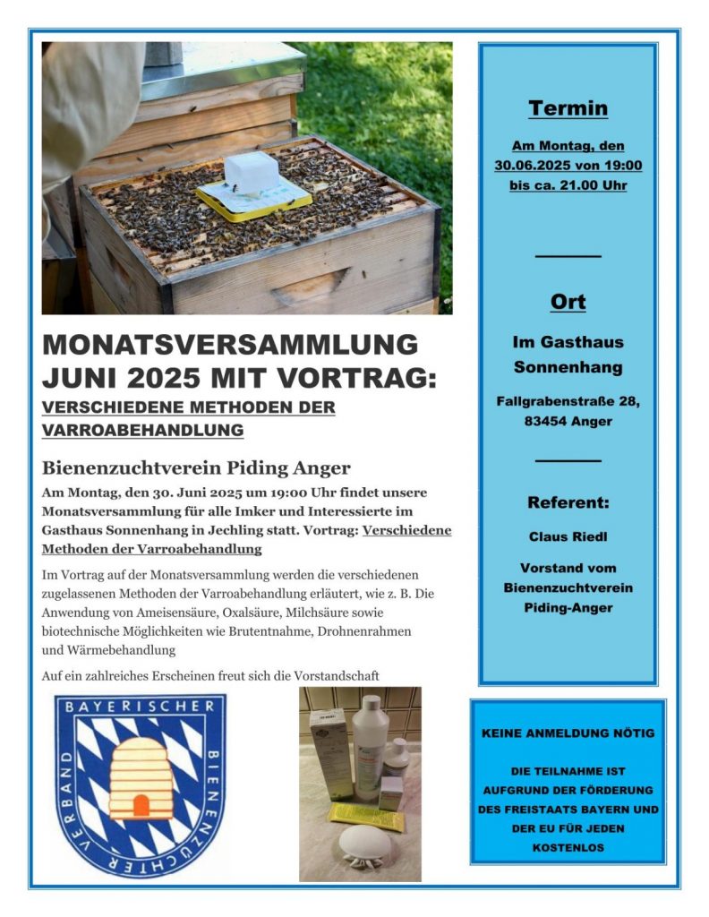 - Montag, 30. Juni 2025 um 19:00 Uhr – Verschiedene Methoden der Varroabehandlung (Vortrag)